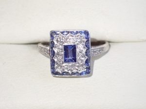 68 K780 A fine platinum baguette cut sapphire & diamond cluster ring with fancy cut sapphires & diamond set shoulders C1920 Band D