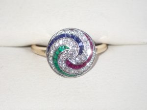 71 An unusual 18ct gold & platinum calibrated ruby, sapphire, emerald & diamond “Turban” swirl cluster ring C1925 Band D