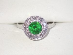 69 A scarce & fine 1.20ct Russian demantoid garnet & diamond cluster ring mounted in platinum C1925 Band E