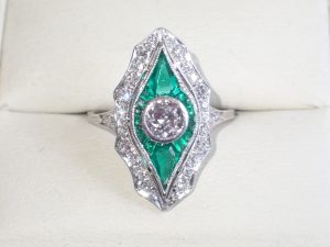 66 A platinum calibrated fancy cut natural Colombian emerald & diamond marquise ring with diamond centre C1925 Band E