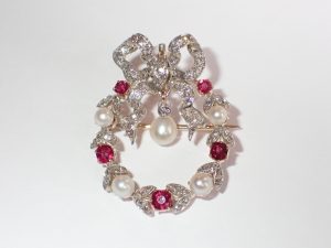 K726 A fine cased 15ct gold ruby, diamond & natural pearl garland brooch/pendant with bow top & removable fittingsC1895 Band E