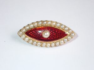 K731 A pretty 15ct gold red enamel & pearl cased brooch/pendant with locket back C1900