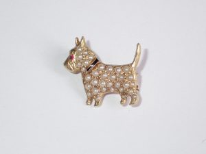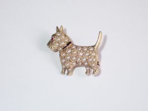 K728 A small 14ct gold pearl set, ruby eyed “terrier” dog brooch with black enamel collar C1910 £585 sold