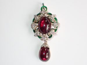 K750 An exceptional Holbeinesque 18ct gold Cabochon garnet, green enamel & diamond pendant/brooch with removable fittings and drop pendant C1860 Band E