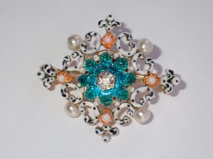 30 A fine quality & condition 15ct gold enamel, natural pearl & diamond brooch with locket back in fitted case C1895 Band D