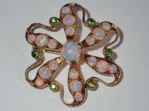 *54 A fine quality & condition 15ct gold opal & Russian demantoid garnet brooch C1900 Band C