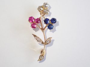 *56 A fine 18ct gold ruby, sapphire & diamond clover flower brooch C1895 Band C