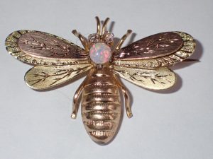 K813 A 9ct multi colour gold engraved bee brooch set with diamond eyes & an opal C1900 Band C sold