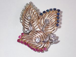 21 A fine 1940s18ct gold & platinum ruby, sapphire & diamond leaf brooch C1940s Band D