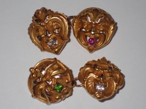 *61 A fine pair of 14ct gold Russian demantoid garnet, ruby & diamond “mask” cufflinks C1900 Band D