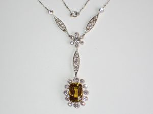 K738 A fine Belle Epoque specimen 10.67ct natural golden yellow Chrysoberyl necklace mounted in platinum & 18ct gold & set with diamonds C1910 Band E