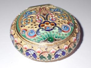 K880 A fine quality & condition Russian 84 zolotnik silver gilt cloisonne enamel round box set with a fine cabochon emerald by the 11th Artels Moscow C1910 Band D sold