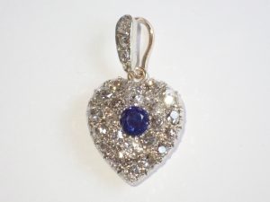 64 A 15ct gold heart shaped diamond pendant with natural sapphire centre C1875 Band D