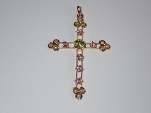 57 K769 A scarce 15ct gold pink tourmaline, peridot & pearl “Suffragette” cross C1910 Band C