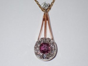 55 E050 A pretty 15ct gold pink sapphire & diamond drop cluster pendant C1890 Band C