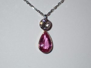 *SM9607AAXX A fine 18ct gold & platinum pear shaped pink sapphire & diamond drop pendant on chain C1910 Band D