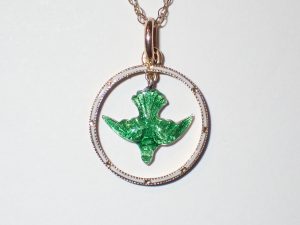 *76 A fine & scarce small silver & gold green guilloche enamel bird pendant signed by Child & Child C1900