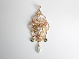 K756 sold A highly unusual 15ct gold large Arts & Crafts pendant set with natural pearl diamond set swan centre, pink tourmalines, demantoid garnets, moonstone & natural pearl drop C1905 Band E