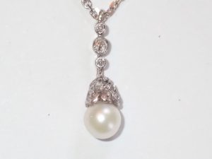 7 A small platinum diamond set natural pearl pendant C1910 Band C