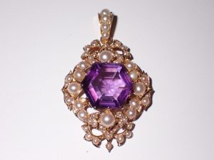 K432 A fine quality 18ct gold amethyst & natural pearl pendant C1895 Band C