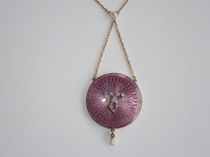 K522 A fine 18ct gold & platinum pink guilloche enamel diamond & pearl pendant with locket back C1910 Band C