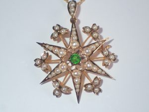 K091 A 15ct gold Russian demantoid garnet & pearl star pendant/brooch c1900 Band C