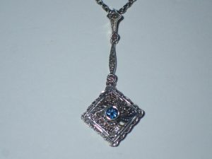 K273 A silver & gold blue zircon & diamond pendant c1910 £885