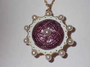K391 A fine quality & condition 15ct gold pink guilloche enamel & white enamel pearl set pendant/brooch locket C1900 Band C