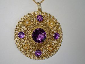 H861 15ct gold Cannetille amethyst and pearl pendant c1900 Band C