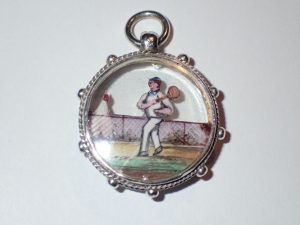 H973 A scarce silver pendant set with a enamelled “tennis” player Birmingham 1891 £685