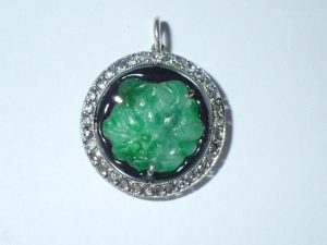 J419 A finely made platinum diamond black enamel and jade small pendant c1925 Band C