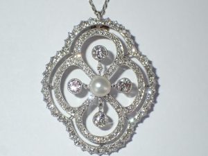 J405 A beautiful platinum Belle epoque natural pearl and diamond pendant/brooch with interchangable fittings c1910 Band E sold