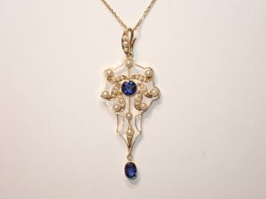 K043 A fine condition 15ct gold sapphire & pearl pendant C1910 Band C