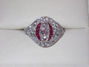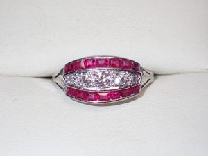 K563 A platinum diamond 5 stone ring with a row of calibrated rubies on both sides C1925 Band C