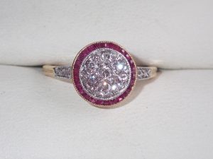 K572 A finely mounted18ct gold & platinum calibrated ruby & diamond cluster ring C1915 Band D