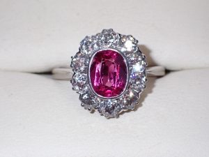 K571 A fine natural pink sapphire & diamond cluster ring mounted in platinum C1930 Band E