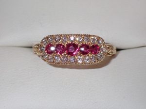 K721 An 18ct gold ruby 5 stone ring surrounded by diamonds C1895 Band D