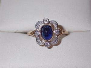 K348 A fine 18ct gold & platinum cabochon sapphire & diamond open cluster ring C1925