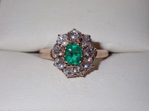 K422 A fine 18ct gold natural Colombian emerald cut emerald & diamond cluster ring Sweden 1900 Band D