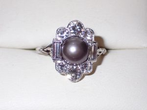K349 A fine natural silver/black pearl ring mounted in platinum & surrounded with a cluster of diamonds C1925 Band E