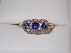 K604 A fine 18ct gold Ceylon sapphire & diamond triple cluster ring Birmingham 1911 Band D