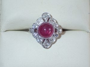 G911 A 18ct white gold and platinum cabochon ruby and diamond cluster ring c1925 Band D