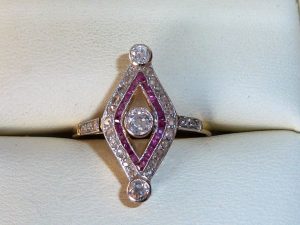 H623 18ct gold and platinum calibrated ruby and diamond marquise ring c1910 Band C