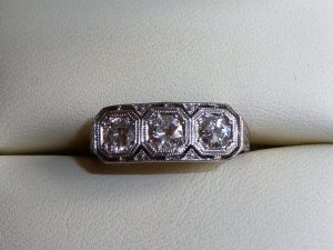 H654 An unusual platinum art deco 3 stone diamond ring (dia’s 0.75cts approx) c1925 Band D