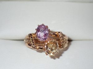 J161 18ct gold natural pink and yellow sapphire cross over ring c1900 Band C