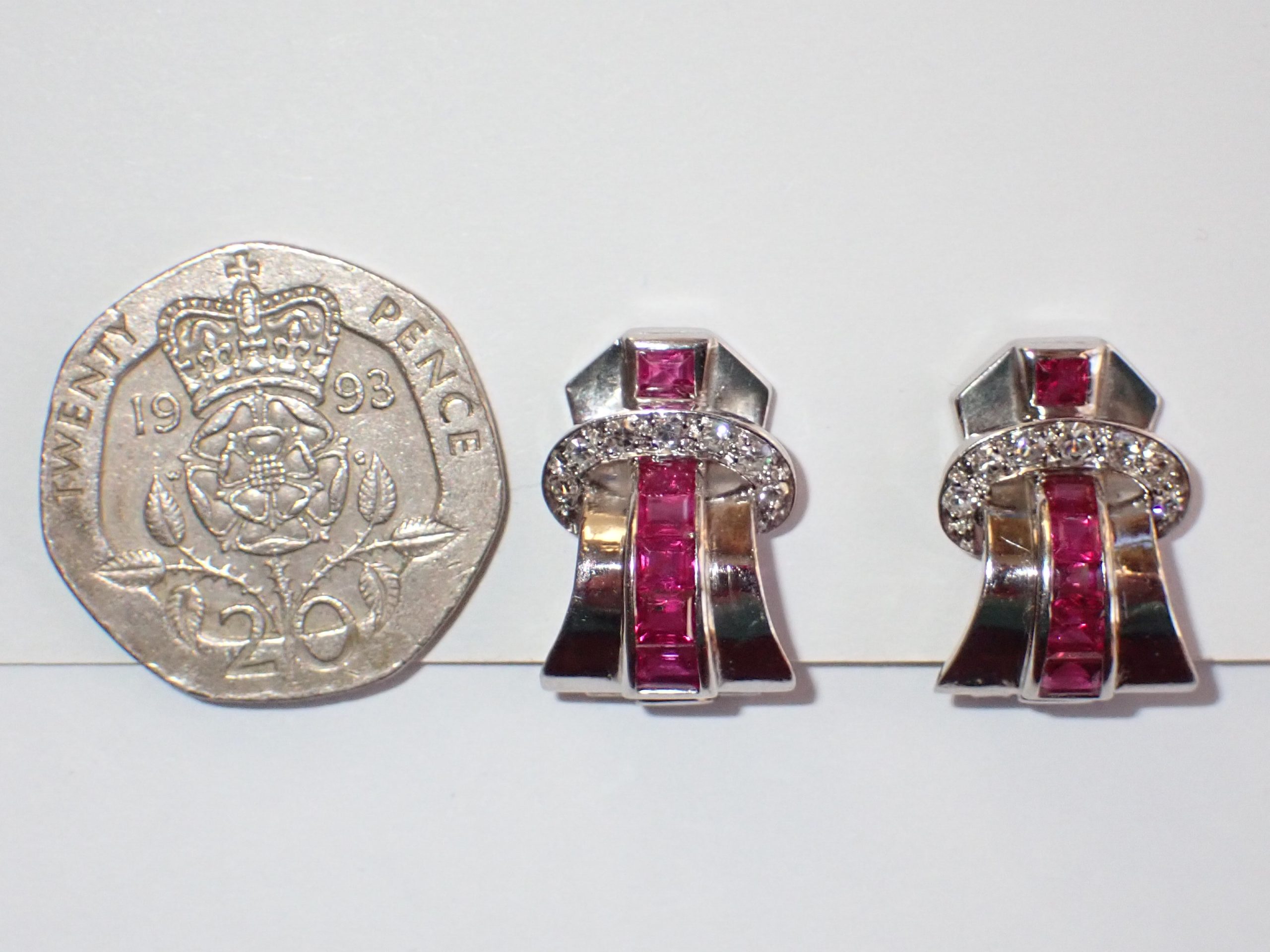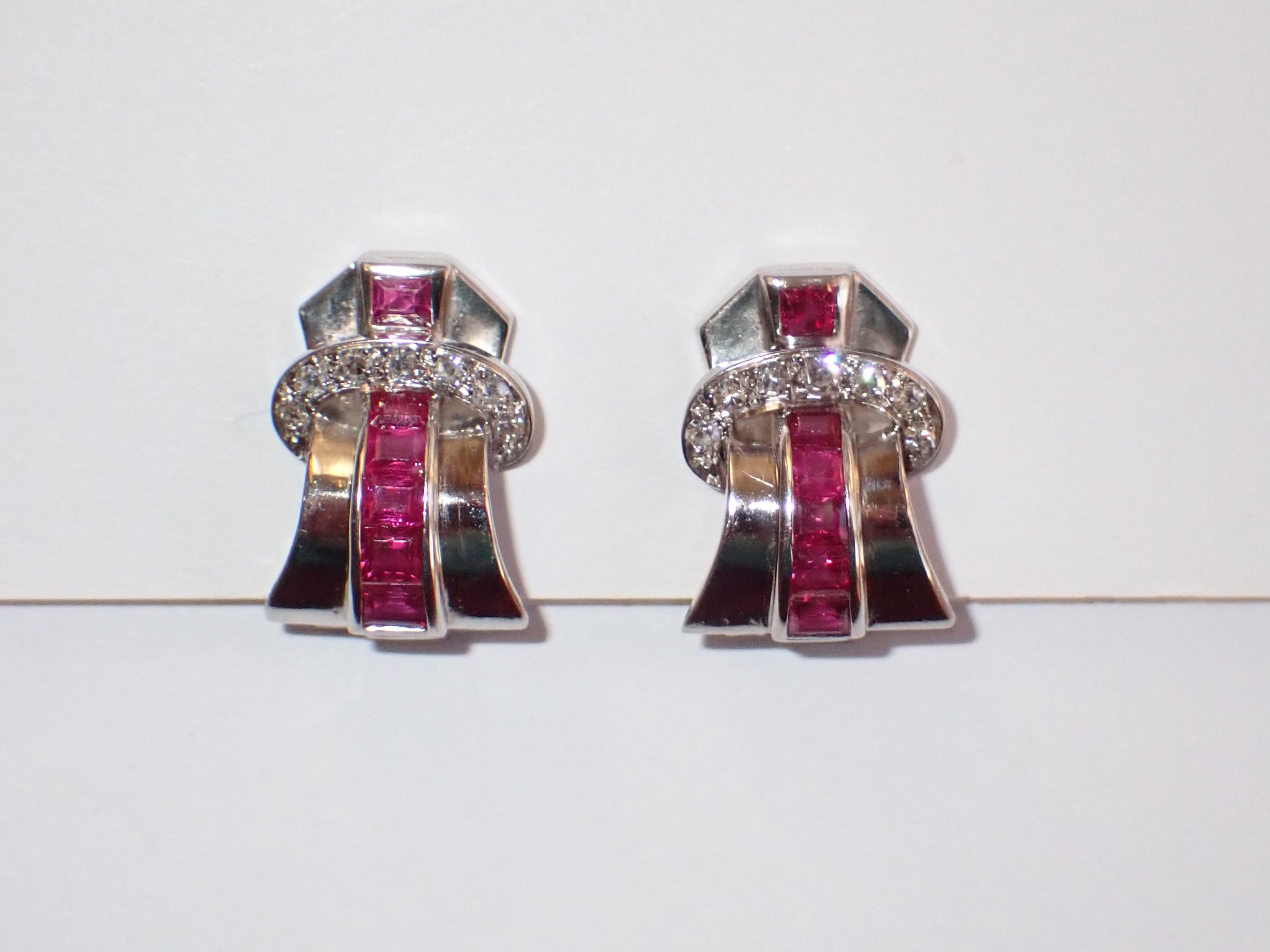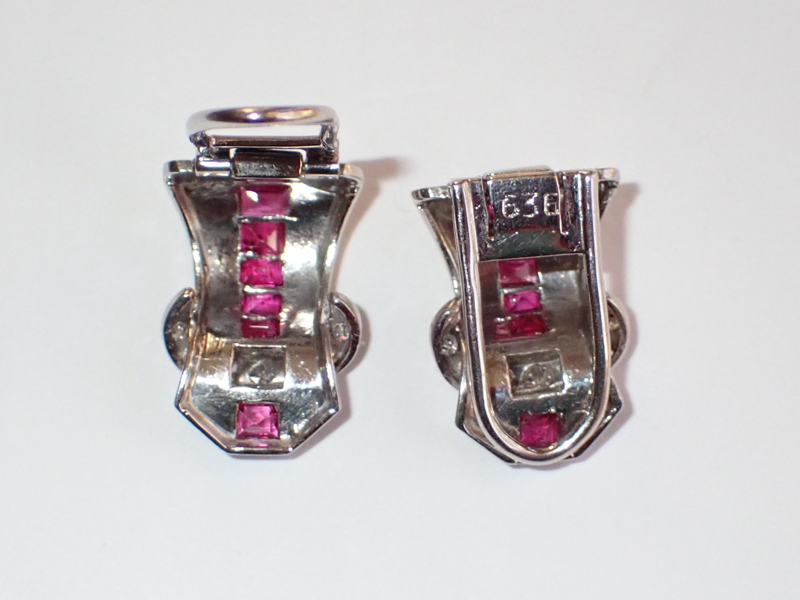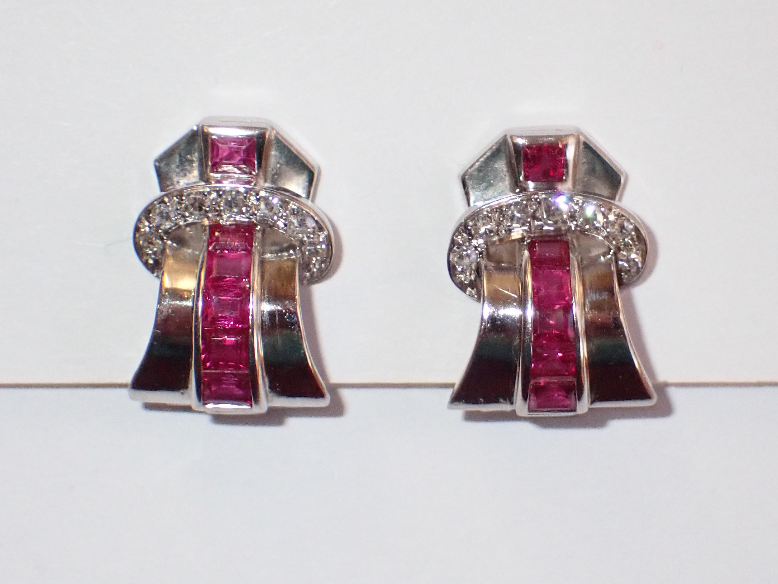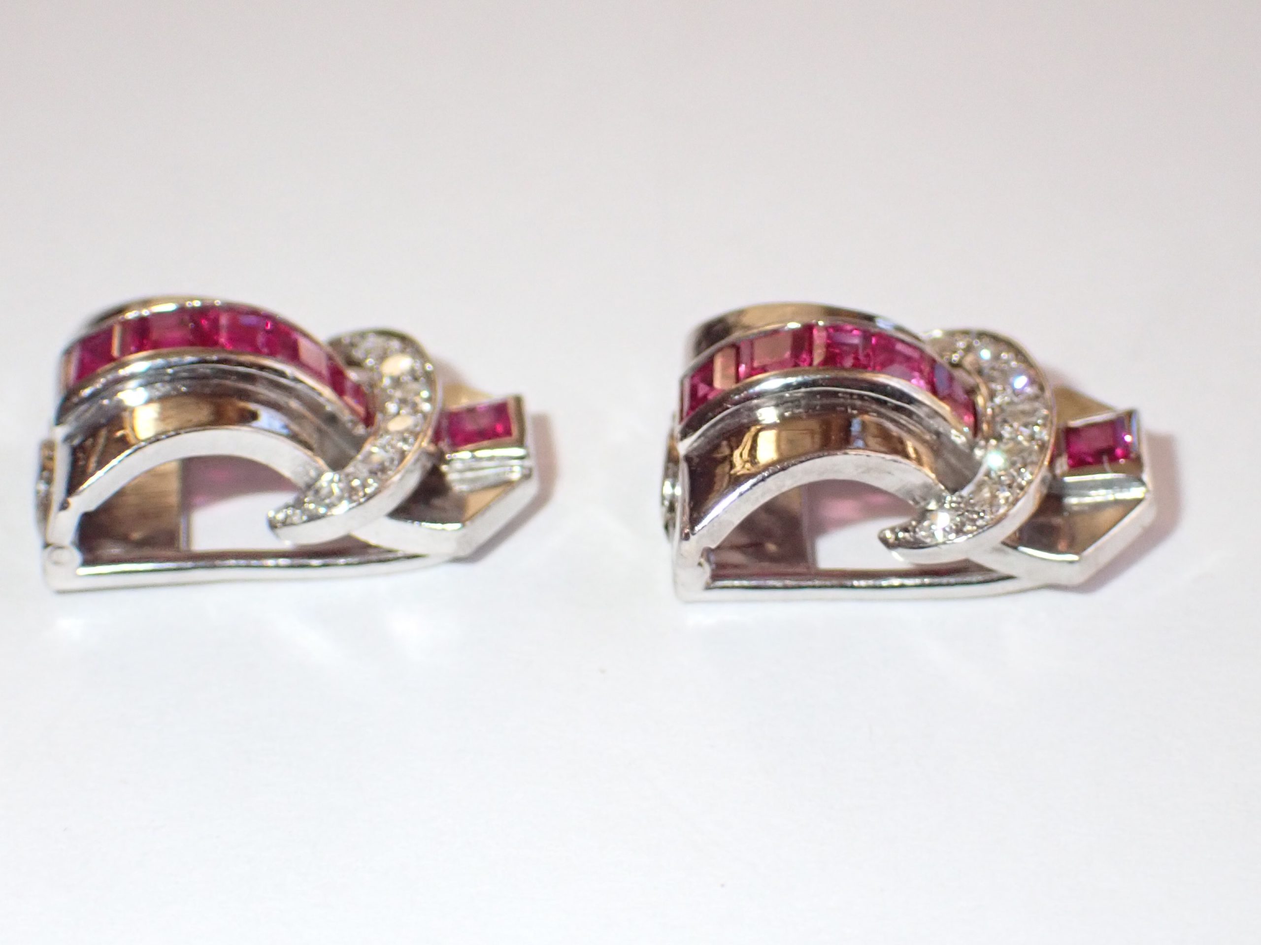 A scarce pair of platinum 1940's calibrated ruby & diamond clip earrings