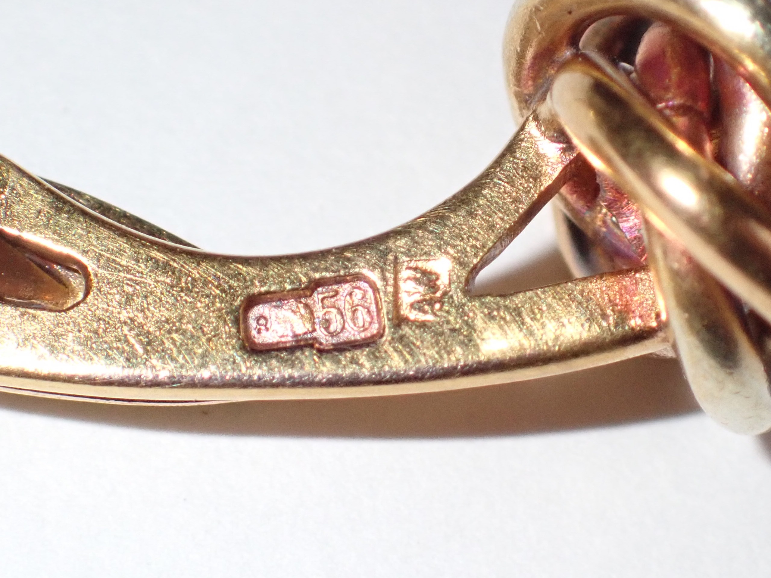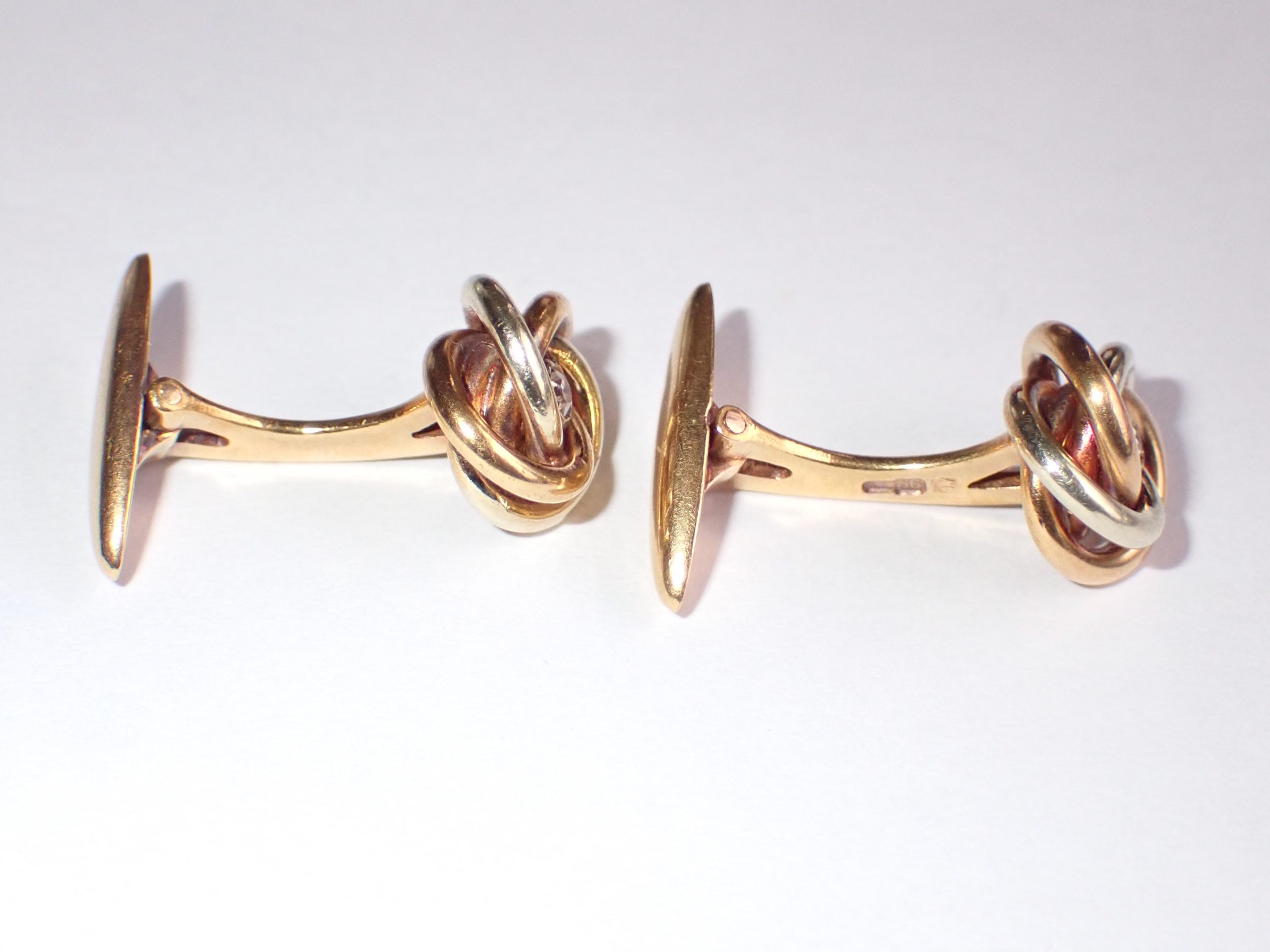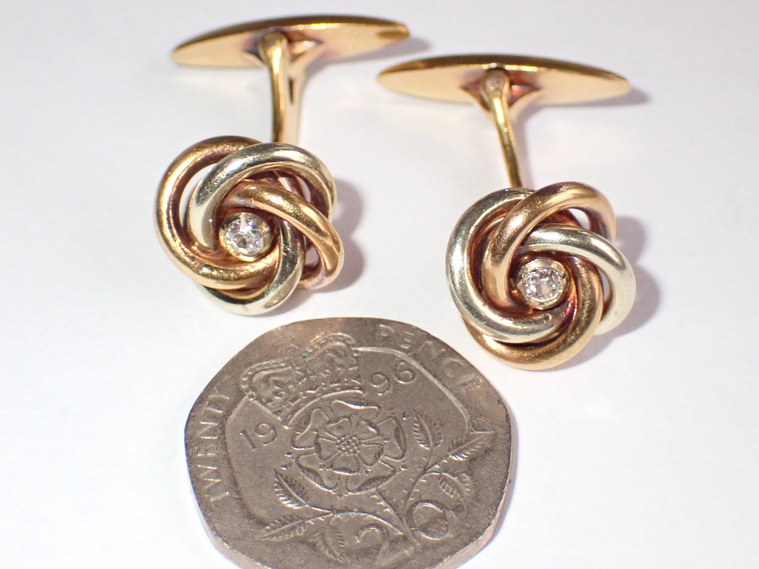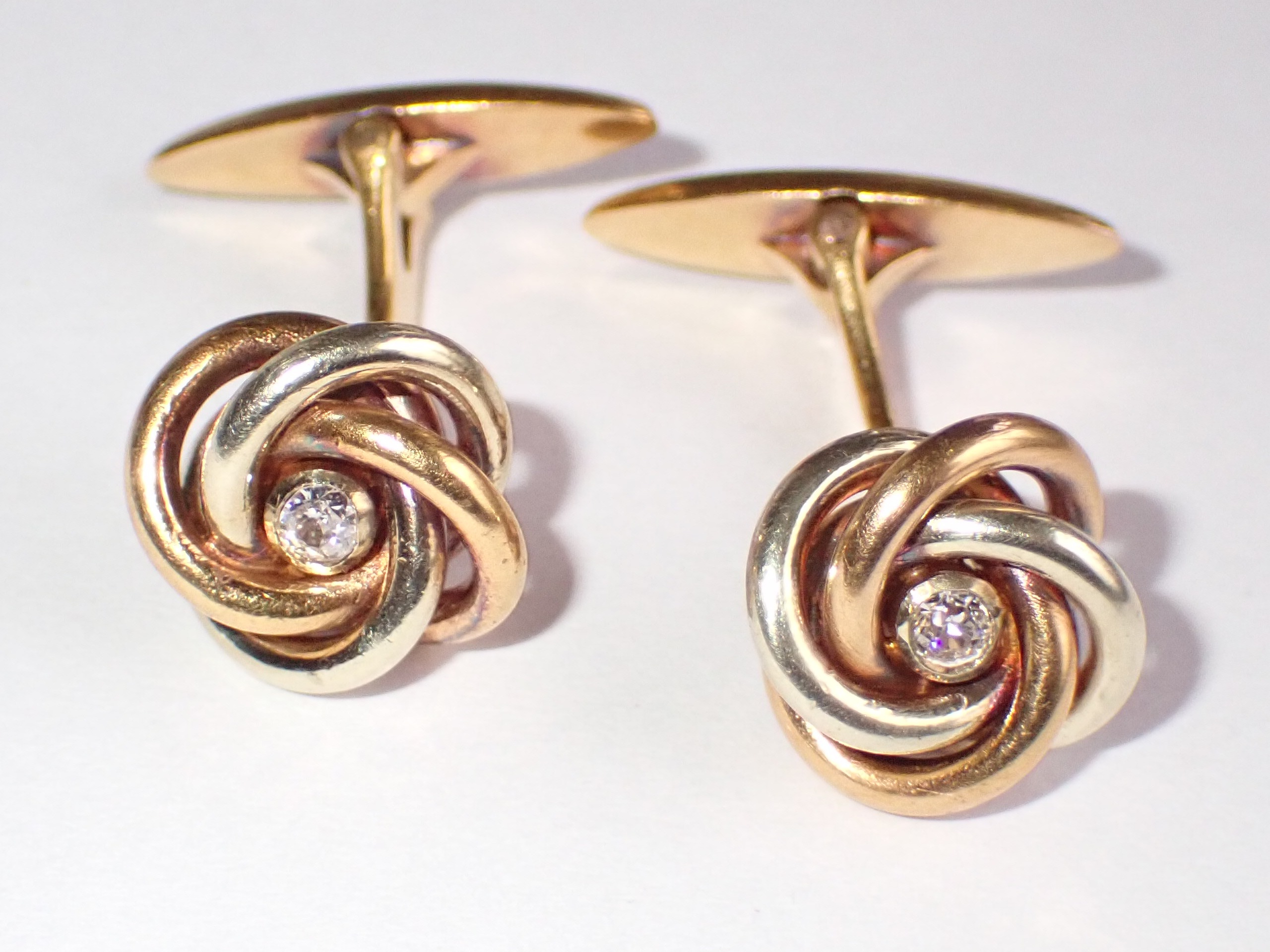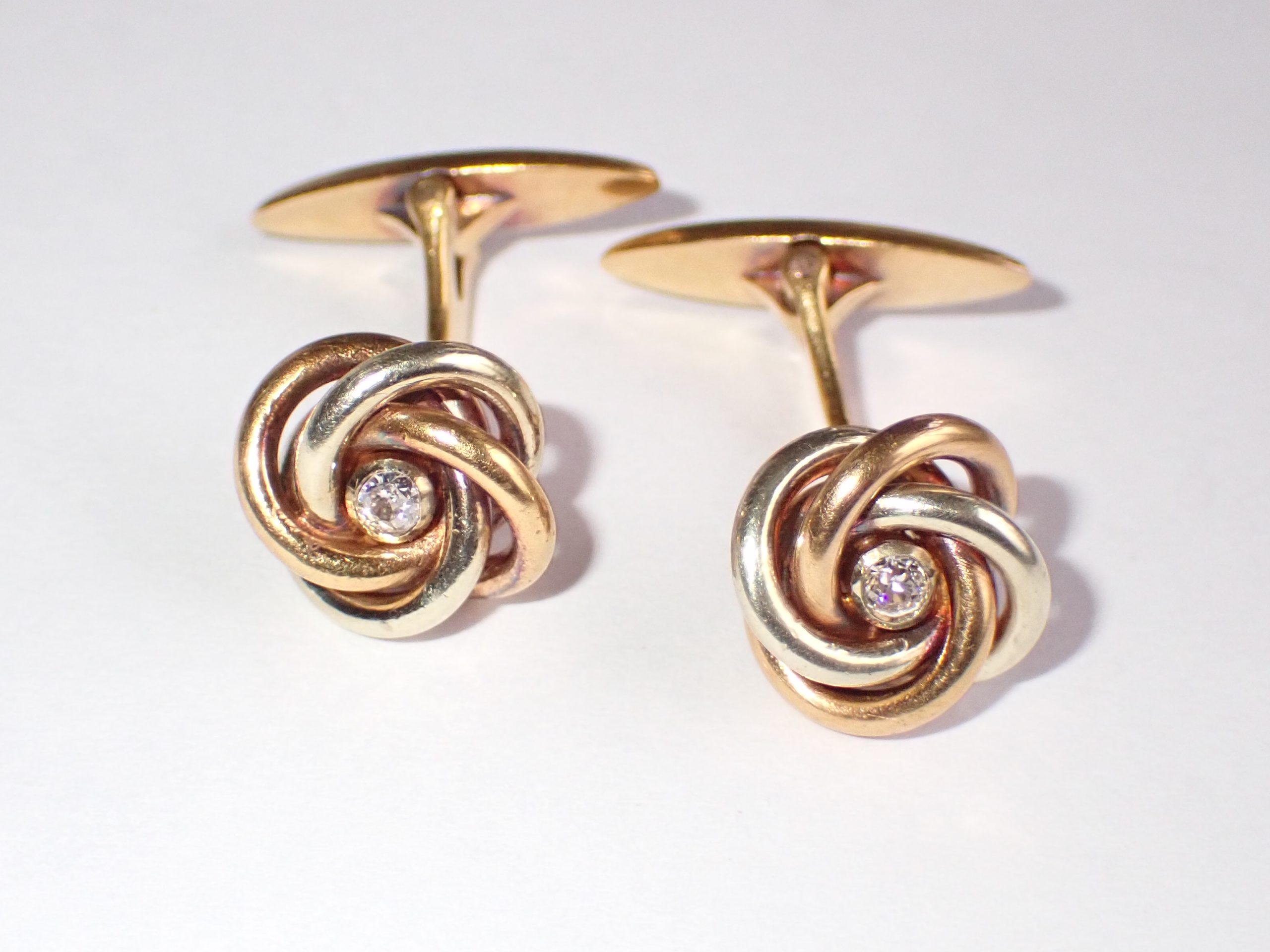 A fine pair of Russian 56 zolotnik 2 colour gold diamond knot cufflinks