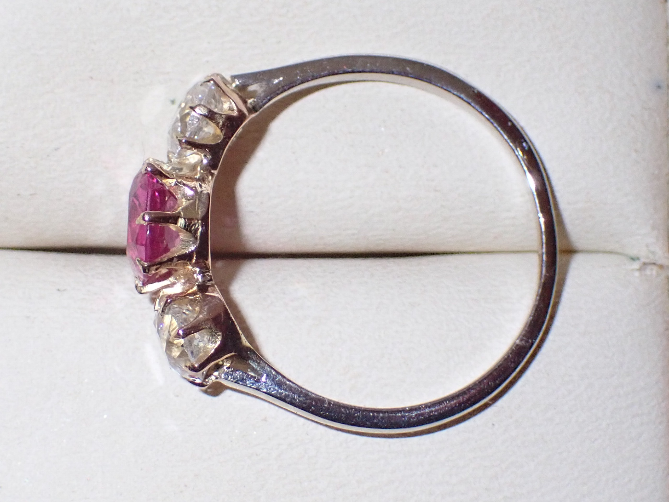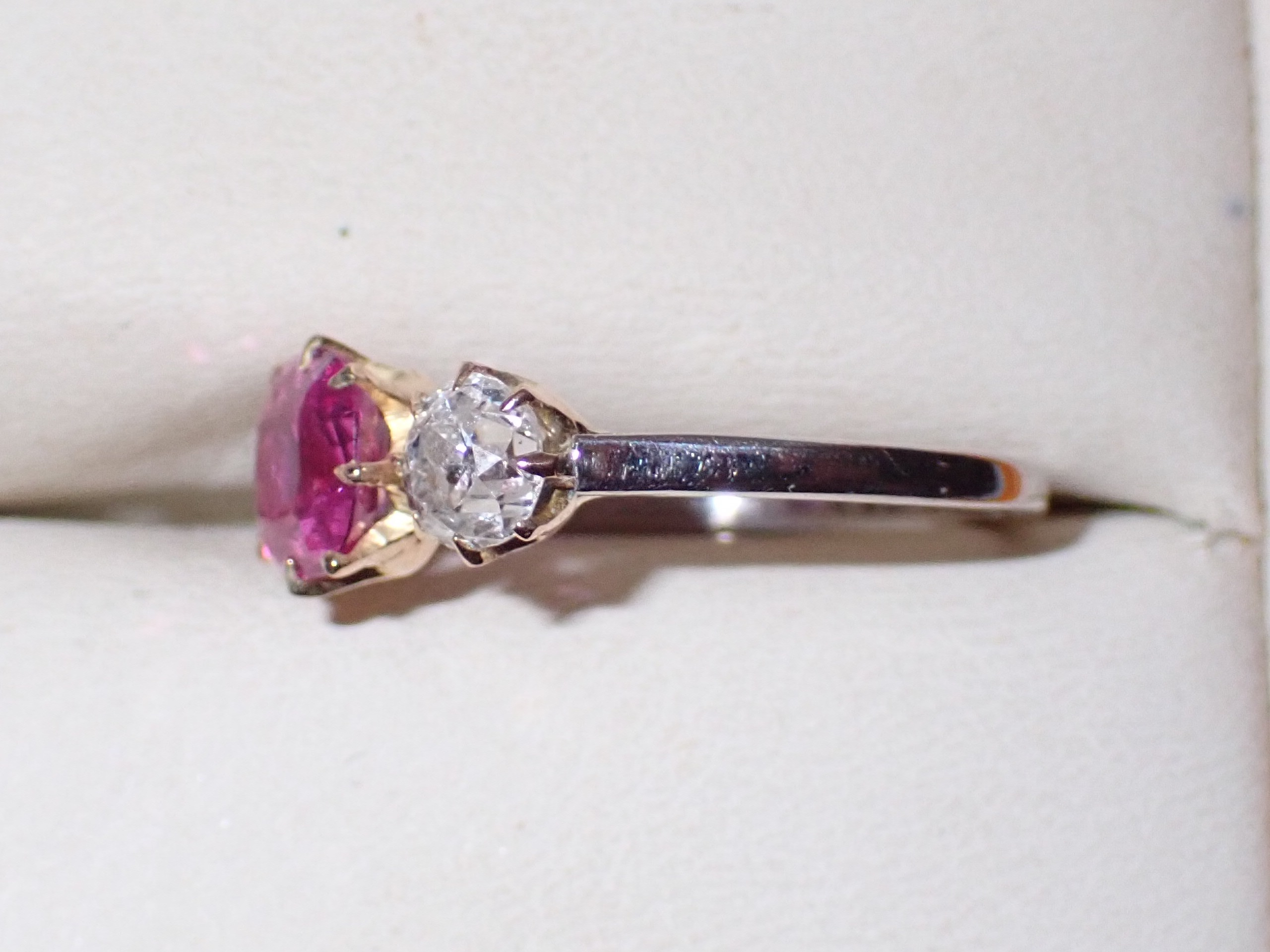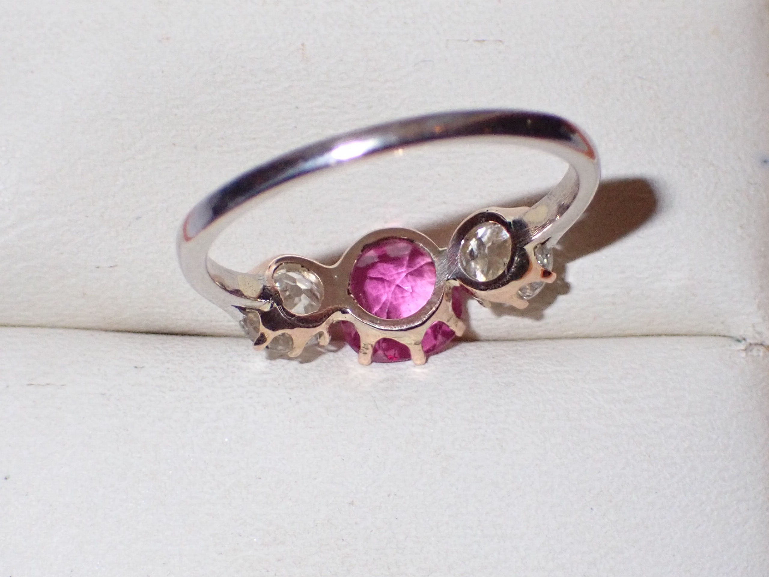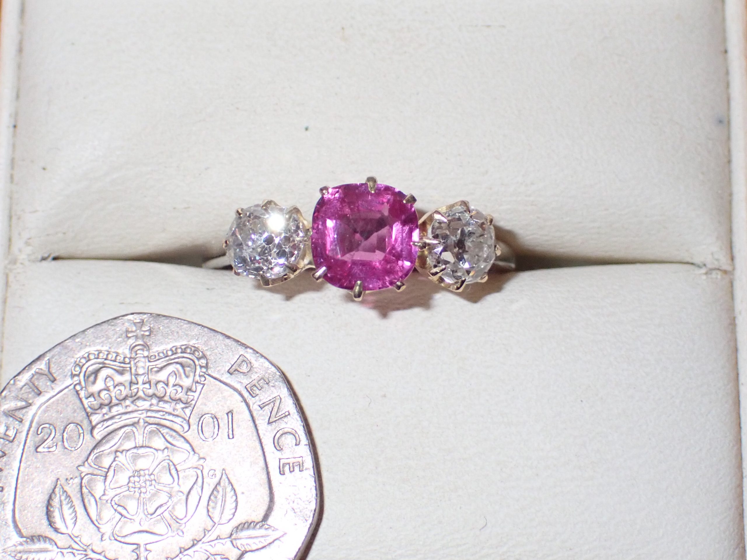 An 18ct gold & platinum cushion cut pink sapphire & diamond 3 stone ring. Pink sapphire min 1.00ct . 2 x diamonds approx 0.90cts