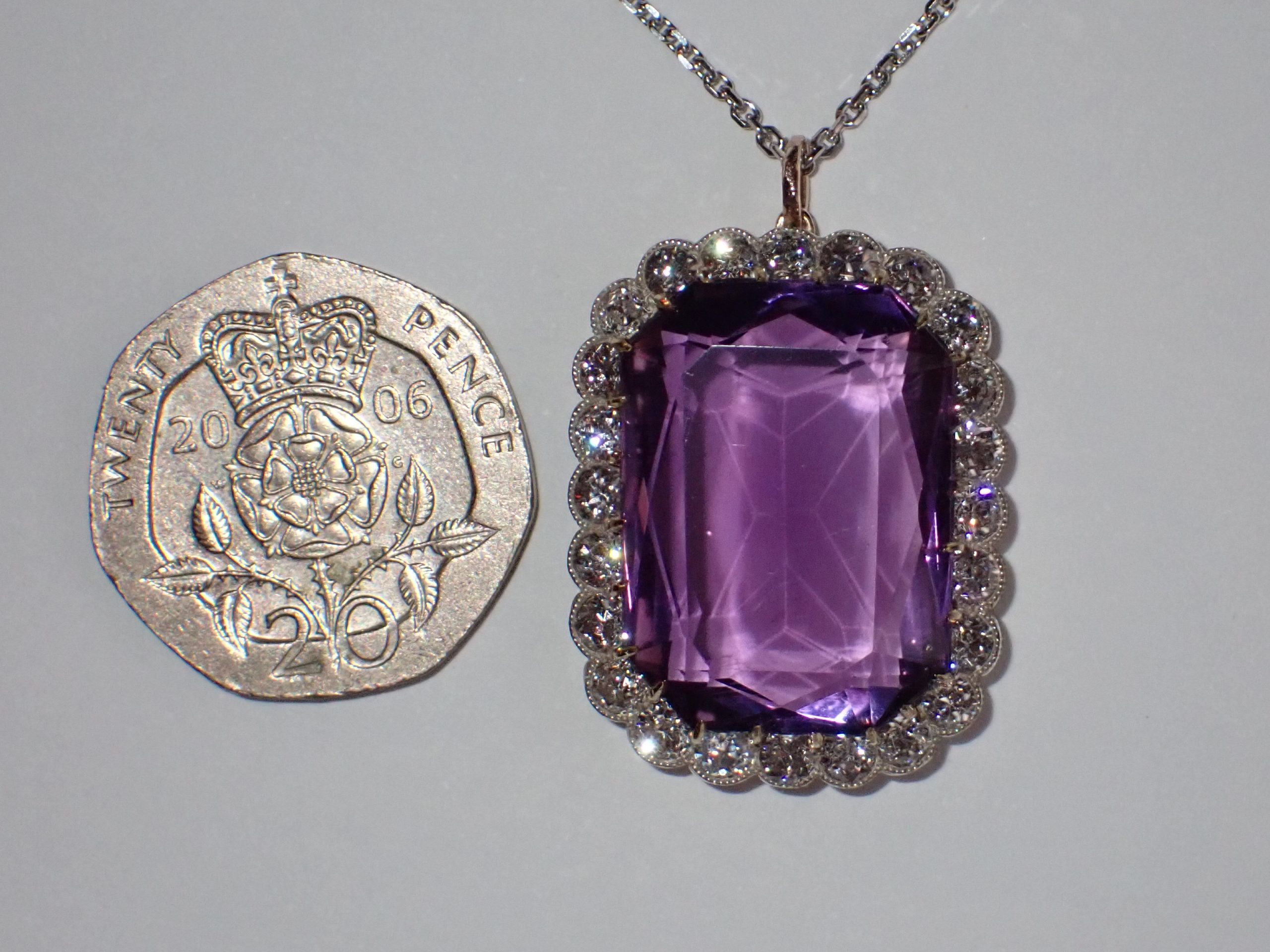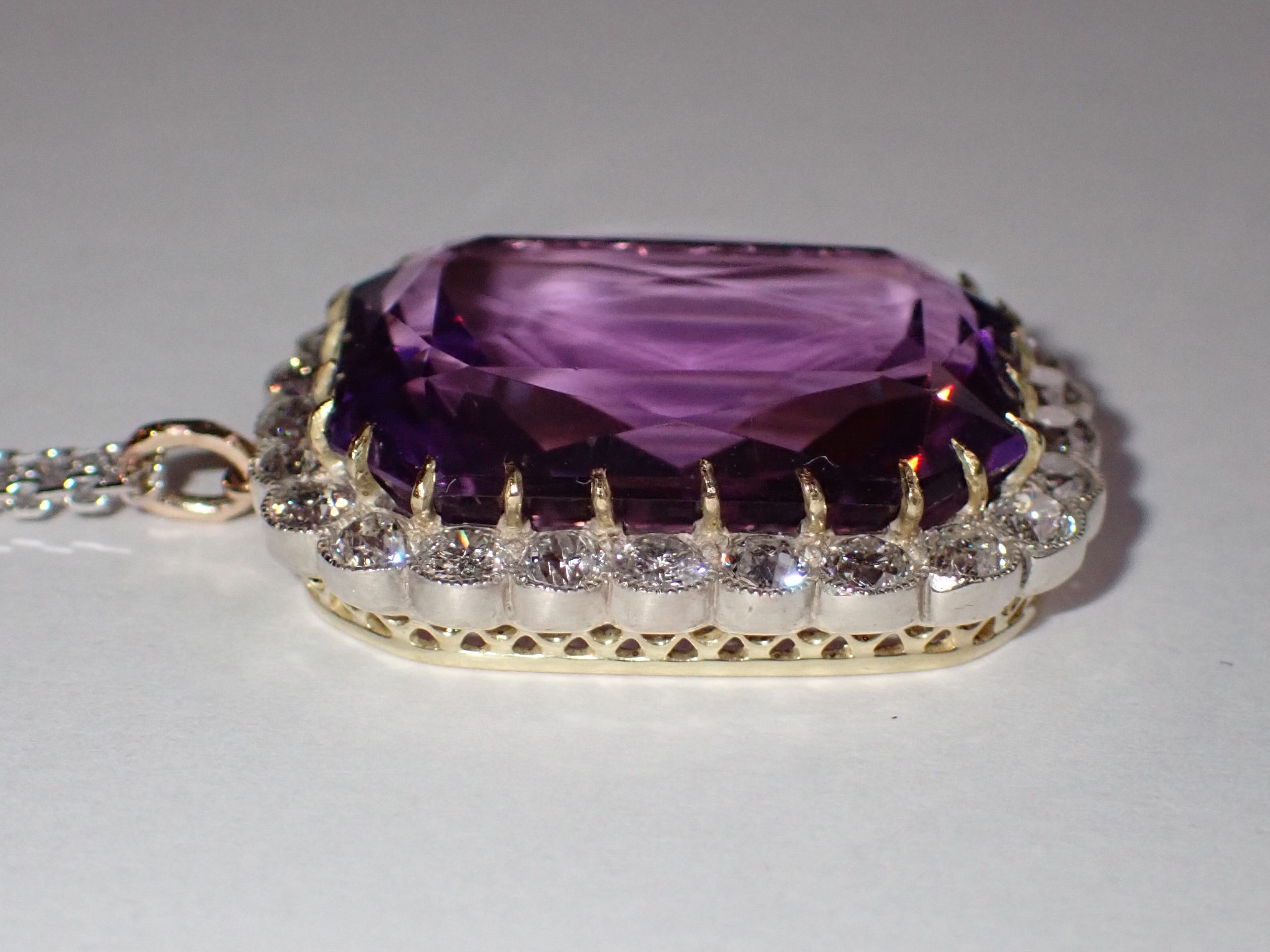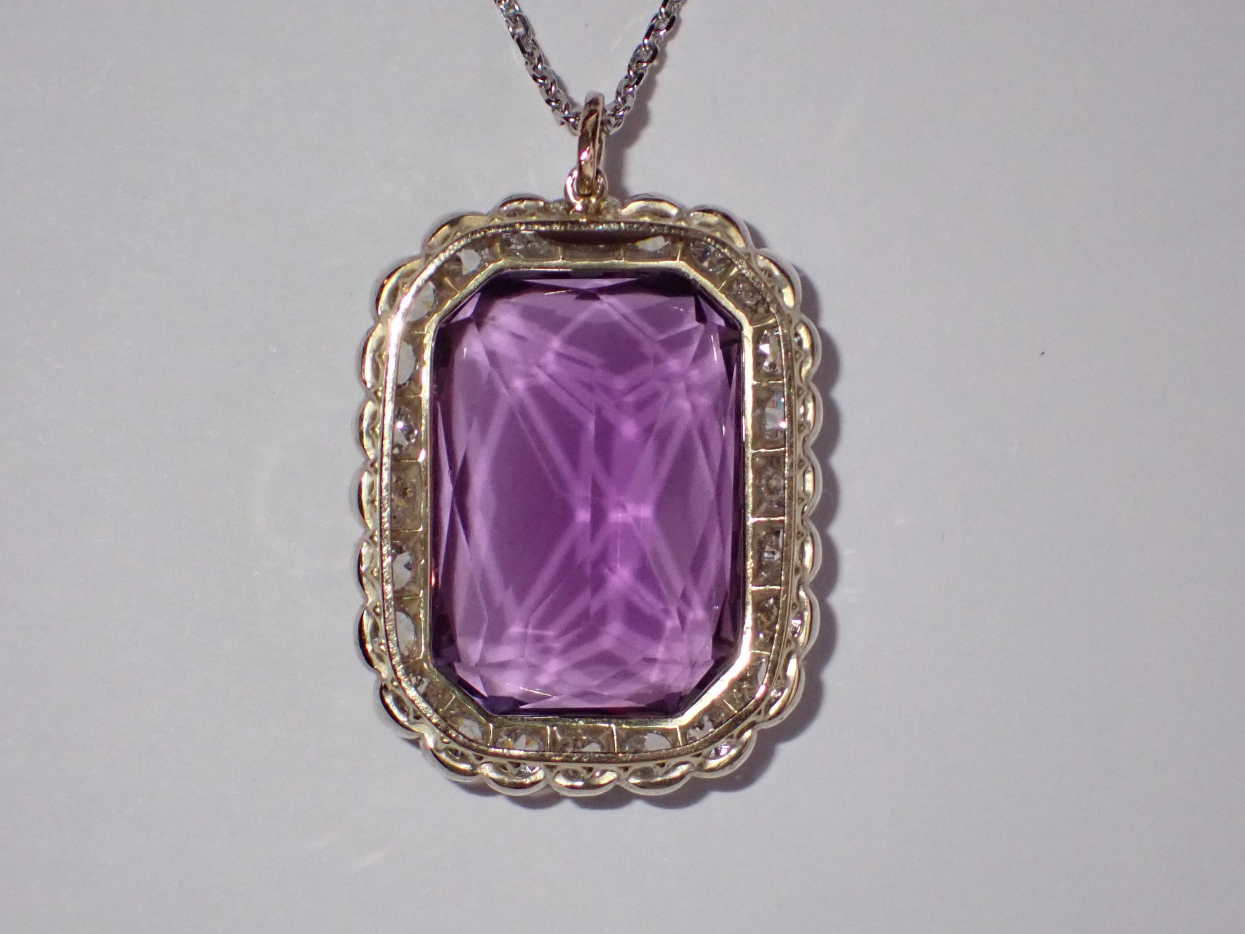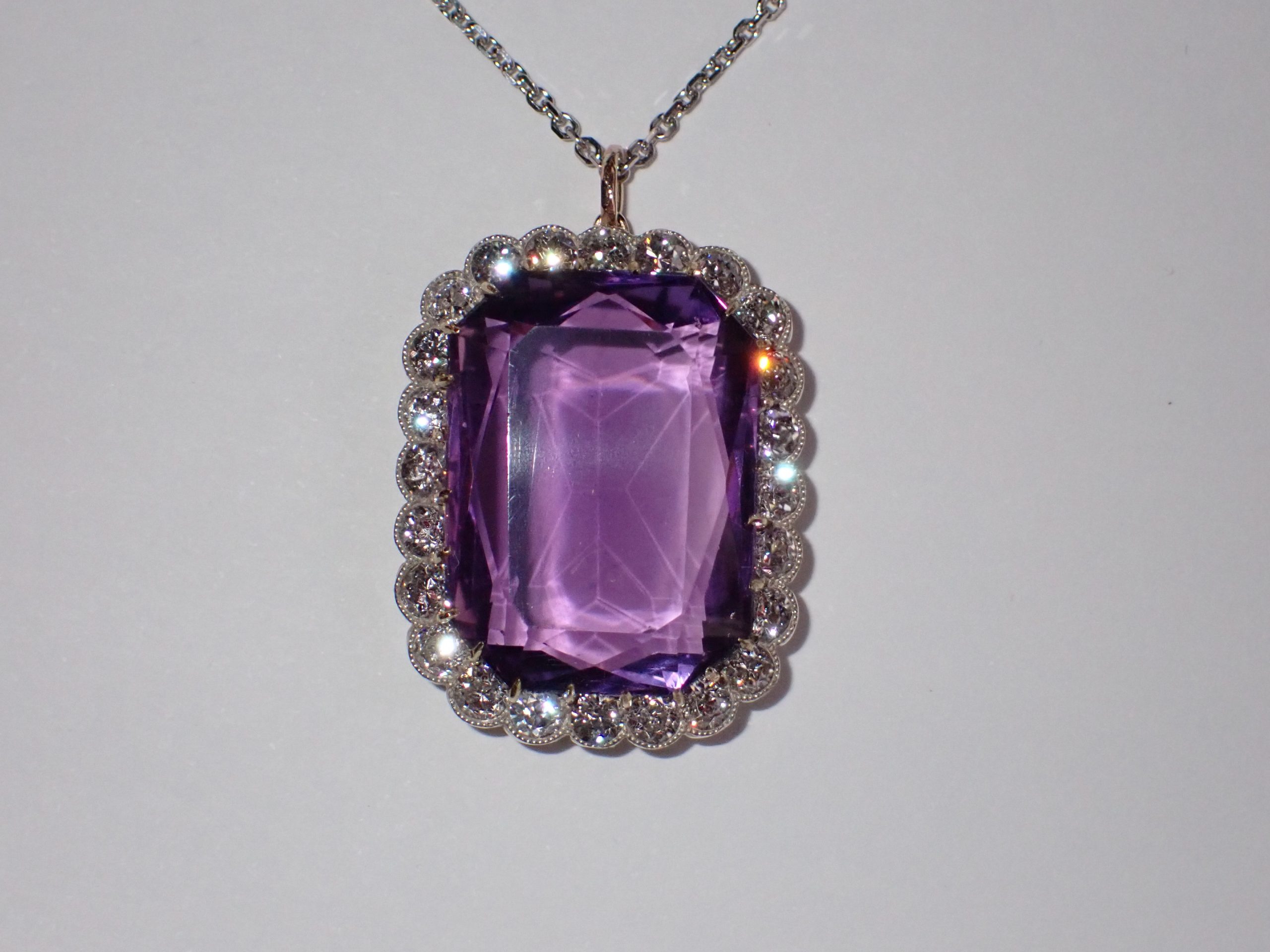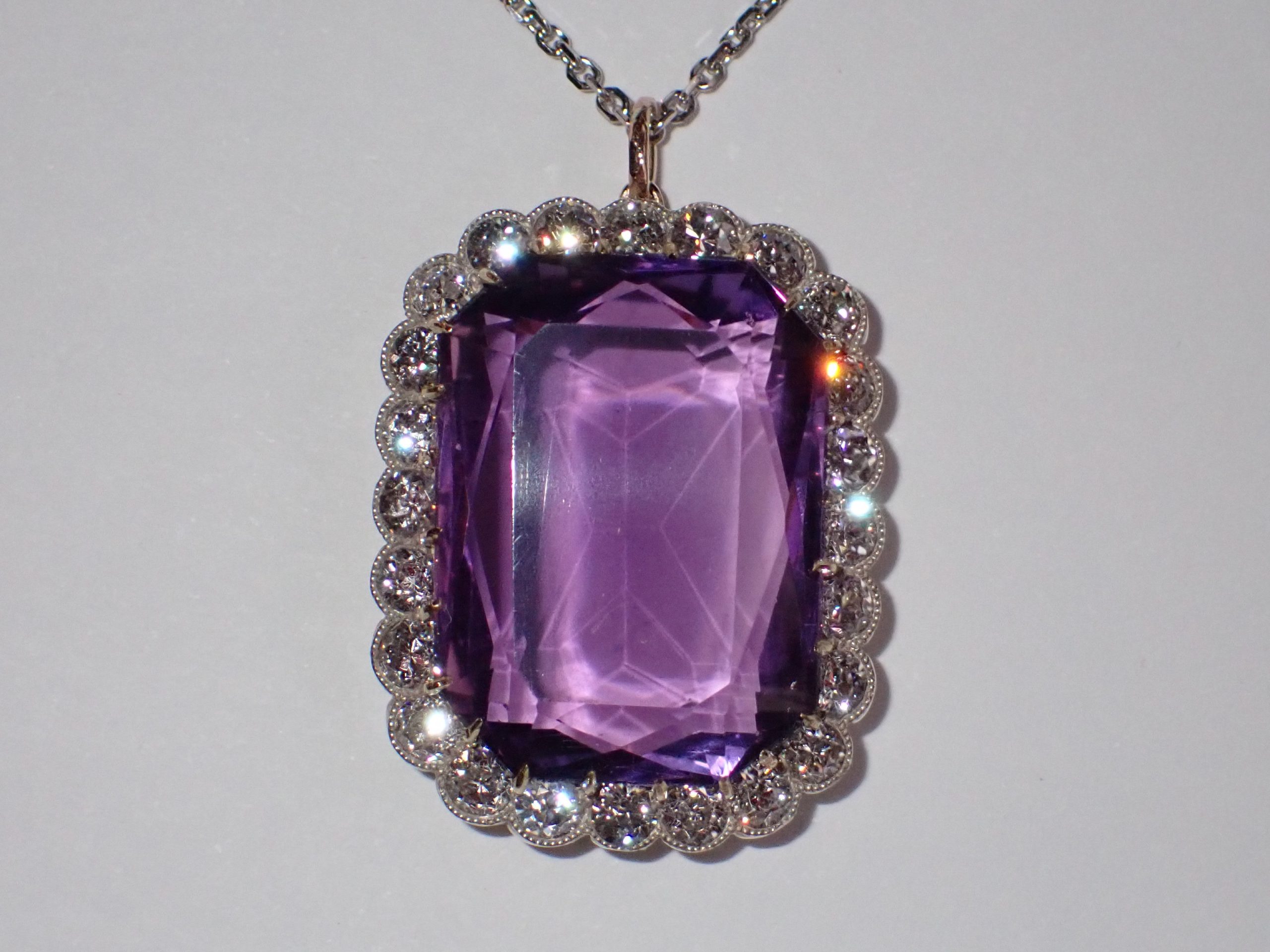 A finely mounted 18ct gold pendant set with a emerald cut amethyst & a cluster of diamond. Amethyst min 20.00cts, 24 diamonds min 1.90cts