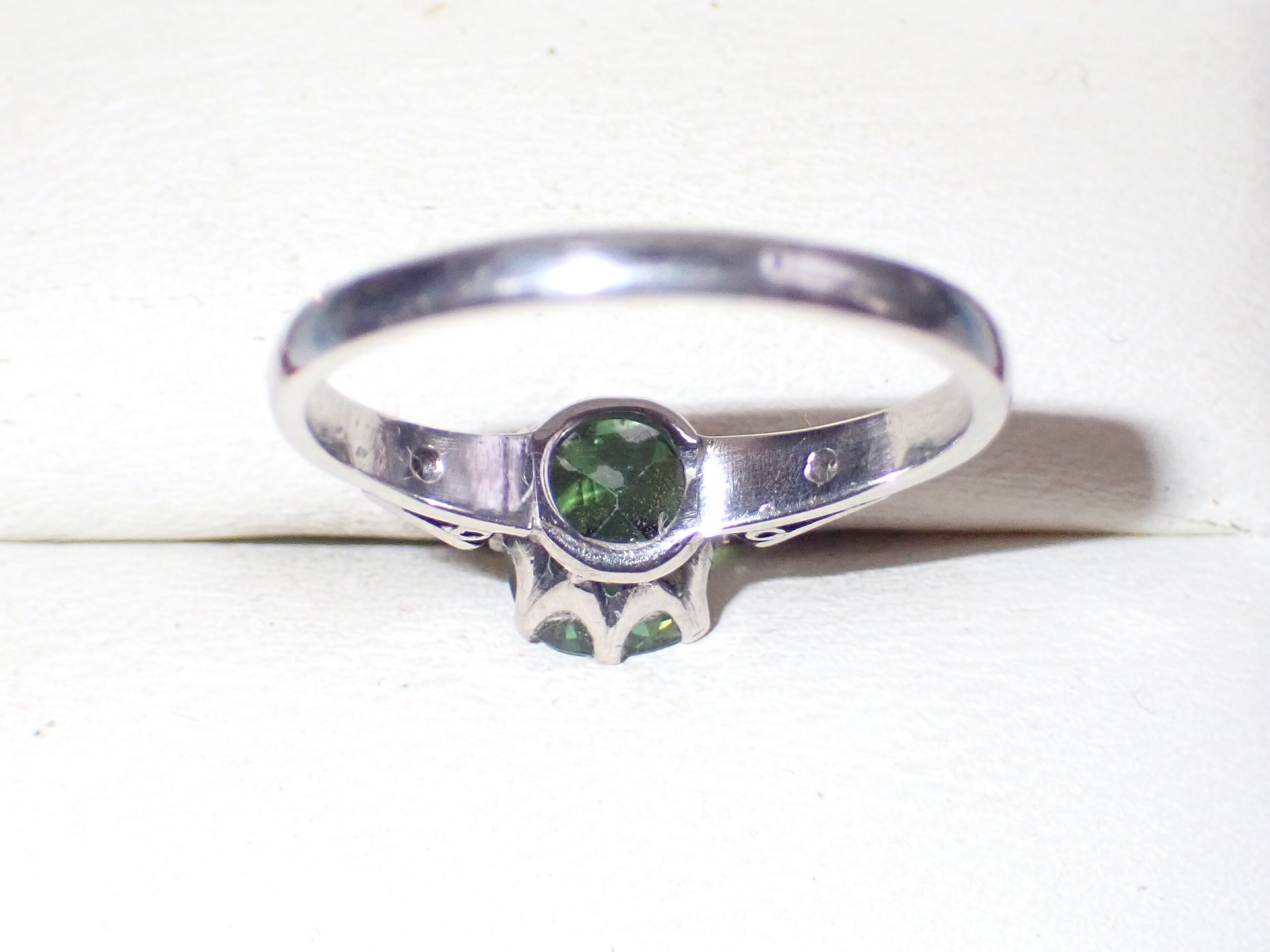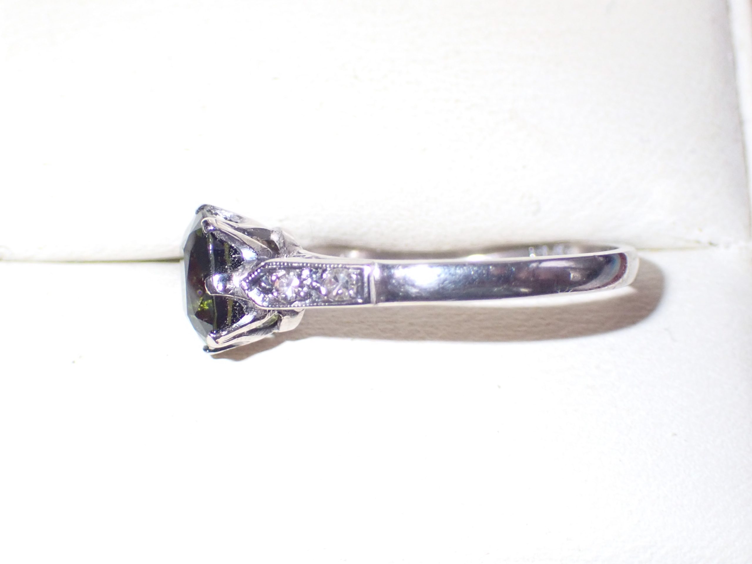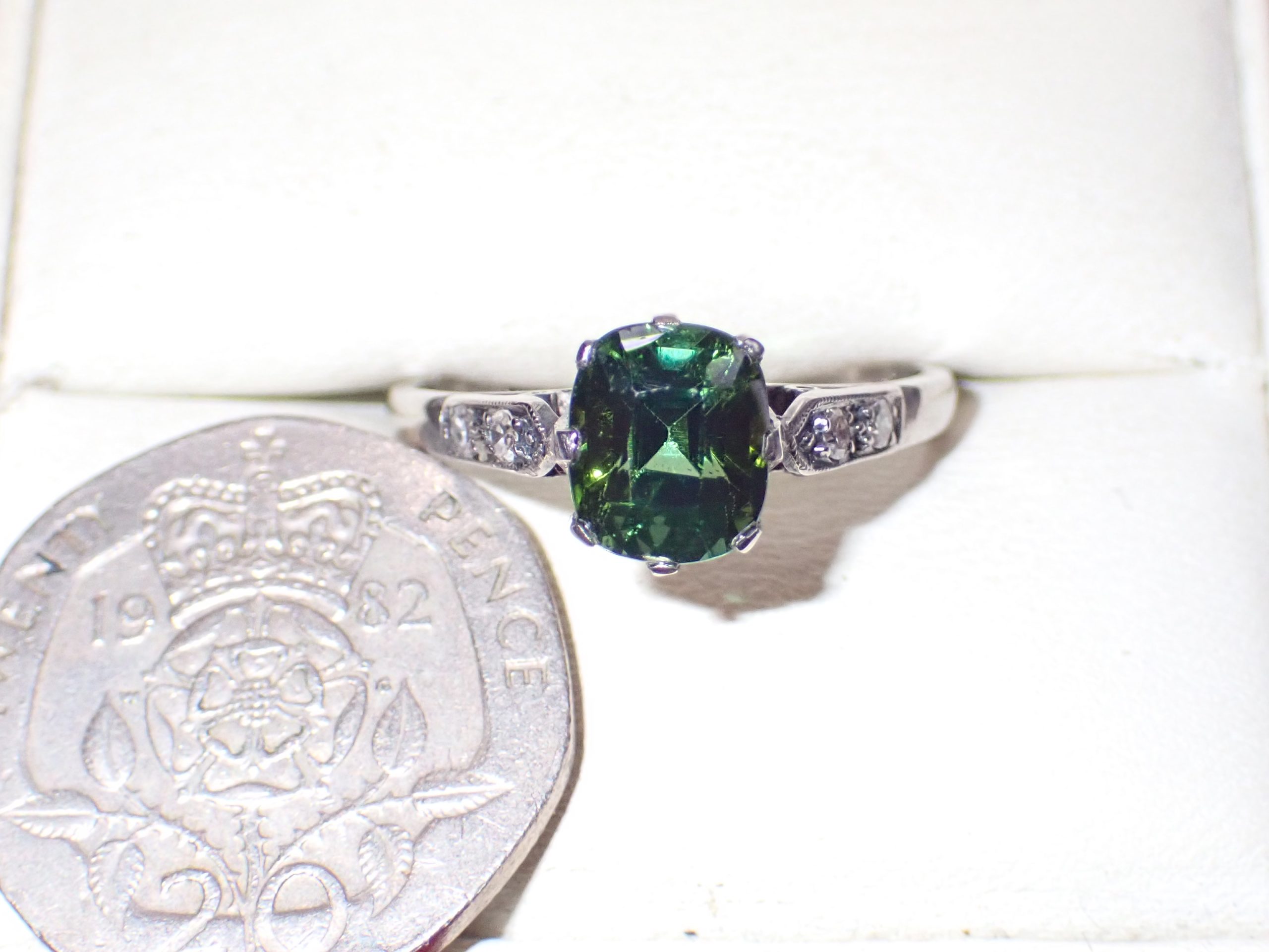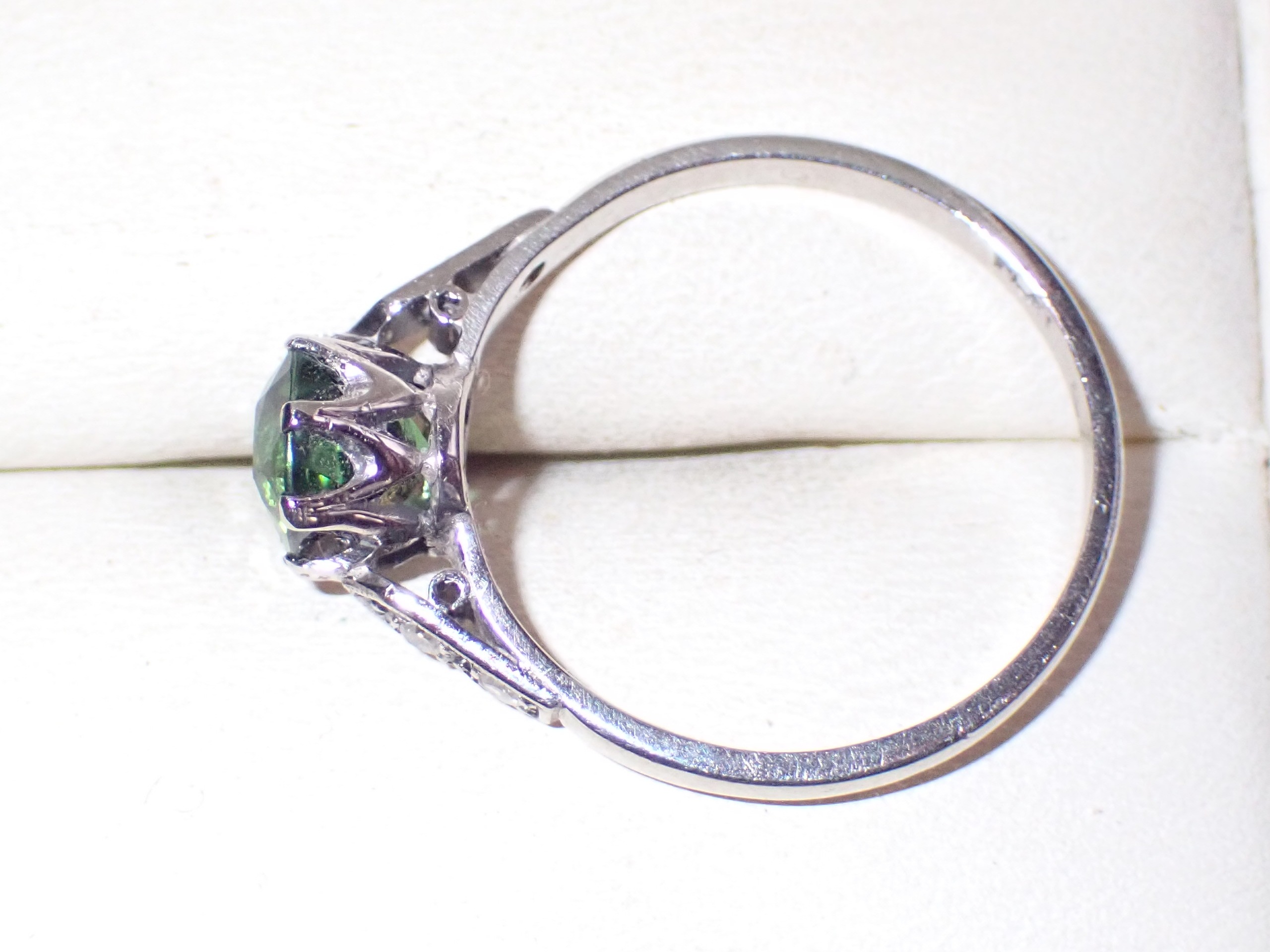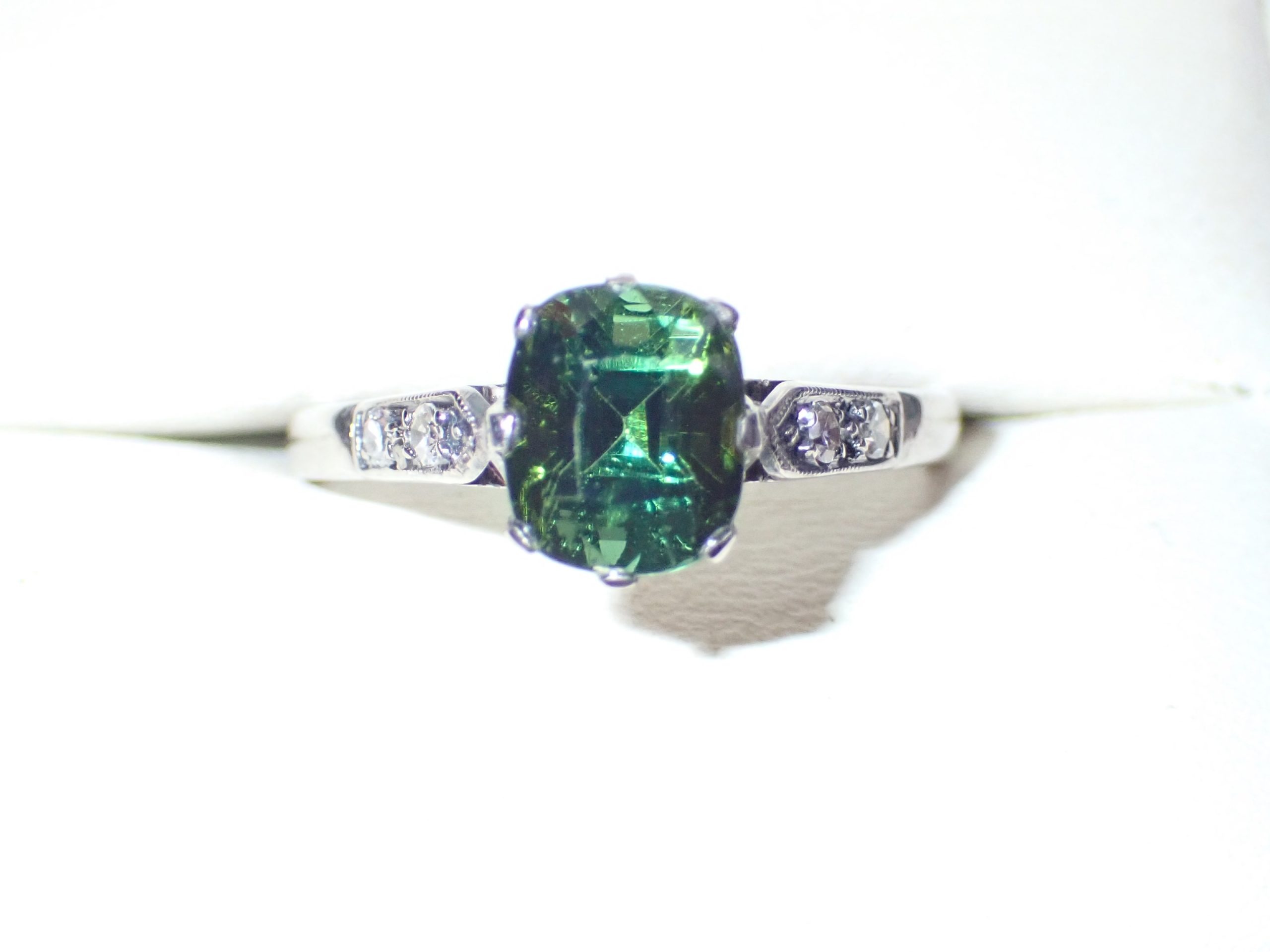 A cushion cut green tourmaline single stone ring mounted in platinum with diamond set shoulders